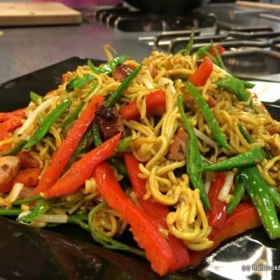 Add the smoked bacon lardons and fry for 1-2 minutes until crispy. Add 1 teaspoon of Amoy Dark Soy Sauce.