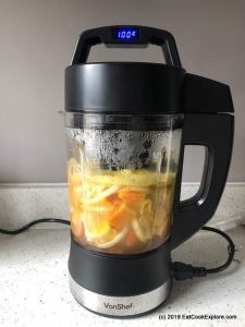 Place the lid on the Vonshef soup maker and press the on button. All the lights will start flashing. Then press the smooth button. The digital display will show the temperature.