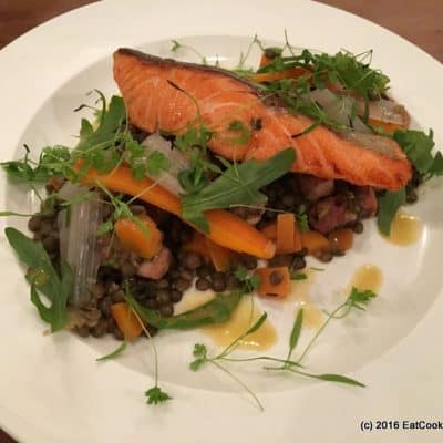 To plate, add the hot lentils to each bowl, followed by the seared trout.