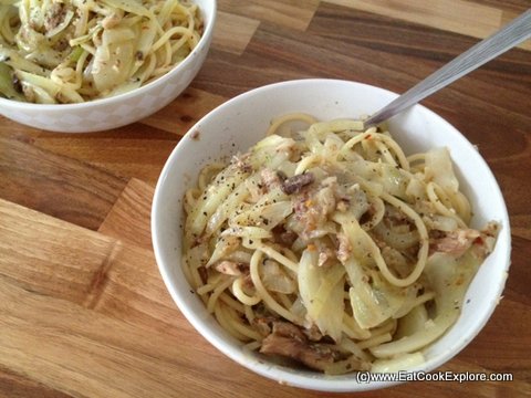 At about ths time, the pasta should be ready, so turn off the heat and using a spaghetti scoop, move the pasta from the pot to the pan with the sauce. (I don't drain my pasta as I want to be able to use the pasta water to loosen the sauce if needed.)